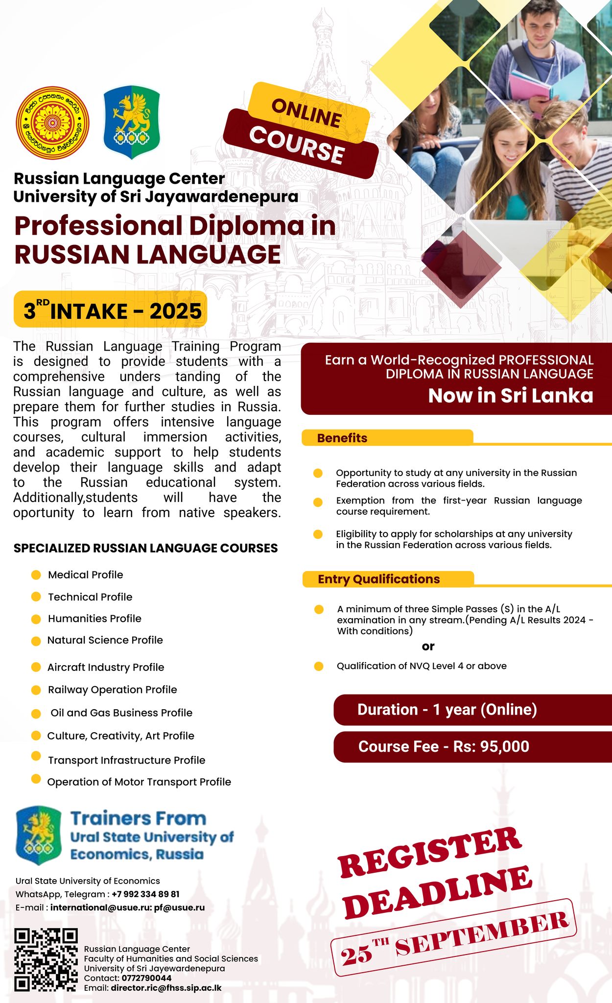 Join the Professional Diploma in Russian Language, a collaborative initiative by the Russian Language Center at the University of Sri Jayewardenepura and Ural State University of Economics, Russian Federation.